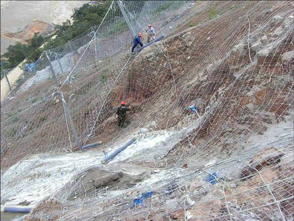 柔性防護網(wǎng):作用原理上類似于噴錨和土釘墻等面層護坡體系,但因其柔性特征能使系統(tǒng)將局部集中荷載向四周均材質(zhì):鋼絲繩網(wǎng)、普通鋼絲格柵(常稱鐵絲格柵)和TECCO高強度鋼絲格柵 勻傳遞以充分發(fā)揮整個系統(tǒng)的防護能力,即局部受載,整體作用,從而使系統(tǒng)能承受較大的荷載并降低單根錨桿的錨固力要求 。具有高柔性,高防護強度,易鋪展性。適應(yīng)任何坡面地形,安裝程序標準化、系統(tǒng)化。系統(tǒng)采用模切化安裝方式,工期短,施工費用低。系統(tǒng)材料的特殊制造工藝和高防腐防銹技術(shù),決定了系統(tǒng)的超高壽命。系統(tǒng)能將工程隊環(huán)境的影響降到最低點,其防護區(qū)域可以充分的保護土體、巖石的穩(wěn)固,便于人工綠化,有利于環(huán)保。