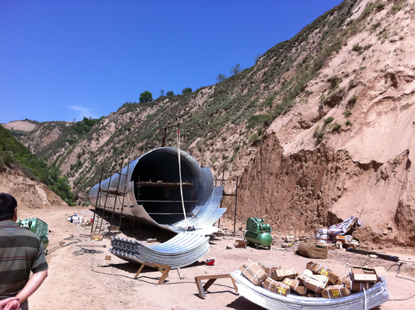 當利用推土機和其它重型設備修筑路其和排水溝時,埋設金屬波紋管涵的挖土、金屬波紋管涵埋設后的回填土和由涵洞出口把水導出去的泄水溝的挖掘等,一般來說是采用機械化作業(yè)的。為了給圓形管拱或拱起金屬波紋管涵而準備好一個平滑床,要鋪上一層厚度10厘米左右的粗砂層或礫石層,該層的材料要求松散些以便金屬波紋管涵能夠埋沒于該層中。該平滑床應具有3-5%連續(xù)坡度,支承金屬波紋管涵管道全長;靥钔翍6英寸一層給予壓實以加固對涵洞的側向支持力。這件事用手提式振動壓實器是可以輕而易舉地做到的。在涵洞上面鋪蓋的土層百度取決于所使用的涵洞材料的厚度,土壤特性,車輛軸重和行駛速度。在生產上推薦的是用承載能力強的土并把它壓實到等于金屬波紋管涵直徑的厚度。