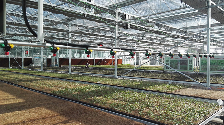 蔬菜集約化育苗裝備及技術(shù)采用配套苗床、軌道式噴灌系統、環(huán)流系統、優(yōu)質(zhì)基質(zhì)、補光系統等設施設備,并通過(guò)嚴格的溫濕光系統環(huán)境控制從而達到育苗生產(chǎn)的標準化、產(chǎn)業(yè)化生產(chǎn)。