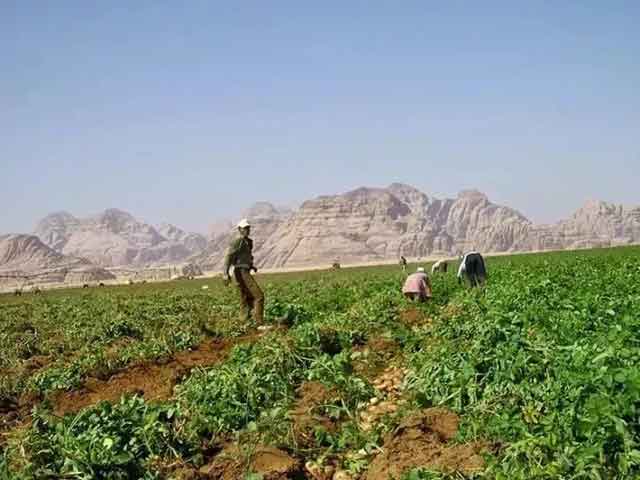 種植者從百米深的地下含水層中抽取水,利用噴嘴對圓形農田進(jìn)行灌溉,這樣可以較大限度節省水源。這里種植的種類(lèi)包括茄子、卷心菜、無(wú)花果、石榴、馬鈴薯、南瓜、西紅柿等多種蔬菜。農場(chǎng)的技術(shù)相當成功,使得目前該農場(chǎng)生產(chǎn)著(zhù)約旦大部分的糧食。